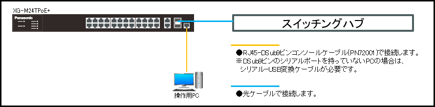 PCとスイッチングハブをコンソールケーブルで接続し、ZEQUO assist Plusなどのターミナルエミュレータにて設定画面を表示します。