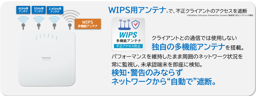 各種アクセス制限機能やファイアウォールを標準搭載、更にWIPS機能も搭載しており、これにより不正アクセスを検知・遮断し、校内ネットワークの安全を確保します。