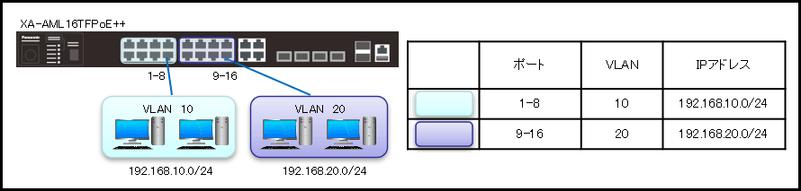 - ポート1-8はVLAN10、ポート9-16はVLAN20とします。