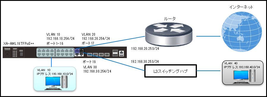 - 192.168.40.0/24宛の通信をL3スイッチングハブに転送します。