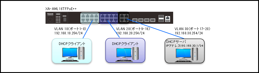 - VLAN10とVLAN20に接続されたDHCPクライアントが、VLAN30に接続されたDHCPサーバからIPアドレスを取得できるようになります。