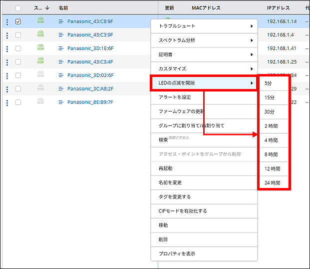 [モニター]>[WiFi]>[アクセスポイント]から対象のAPを右クリックし、[LEDの点滅を開始]をクリックしてください。