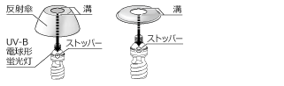 反射傘の溝とUV-B電球形蛍光灯のストッパーの位置を合せて、図のように反射傘を蛍光灯の口金方向から取り付け。