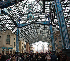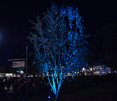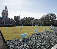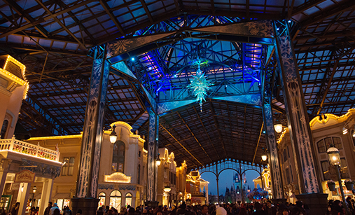今回のイベントでは、大人気映画『アナと雪の女王』の世界を再現するための、照明演出をサポートさせていただきました。エントランスやワールドバザールの照明、木々を照らすスポットライトなど、きれいなブルーの光で演出をサポートできて、まずはホッとしています。