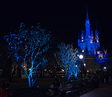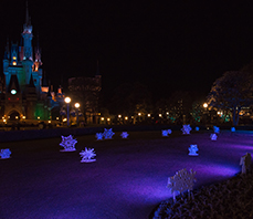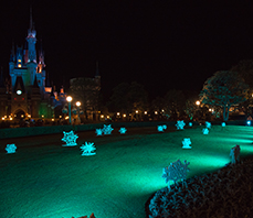 エントランスにあるフォトロケーションやワールドバザール、お城の周りの木々などにも映画のイメージに合わせたブルーやグリーン系の色を照明に多用しました。