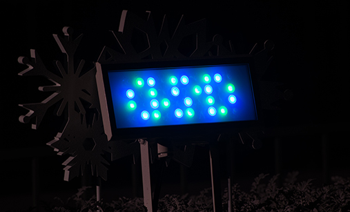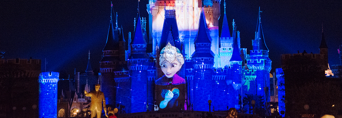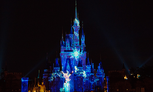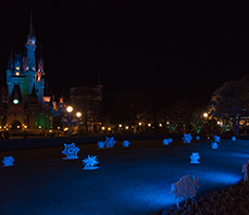 お城の周りを照らすフルカラーLEDは、青と緑と赤の3色のLEDライトを細かく調整することで、『アナと雪の女王』の世界観であるブルーグリーンを演出しています。