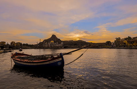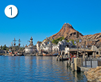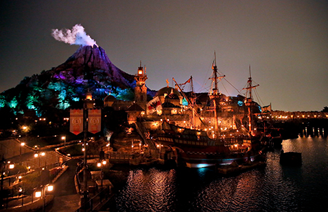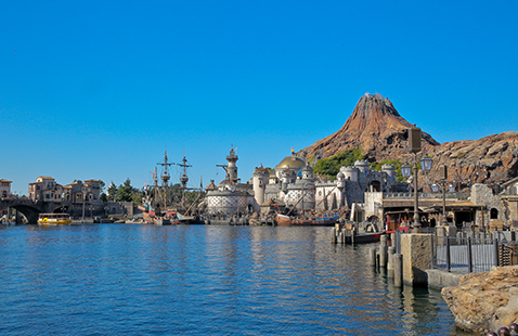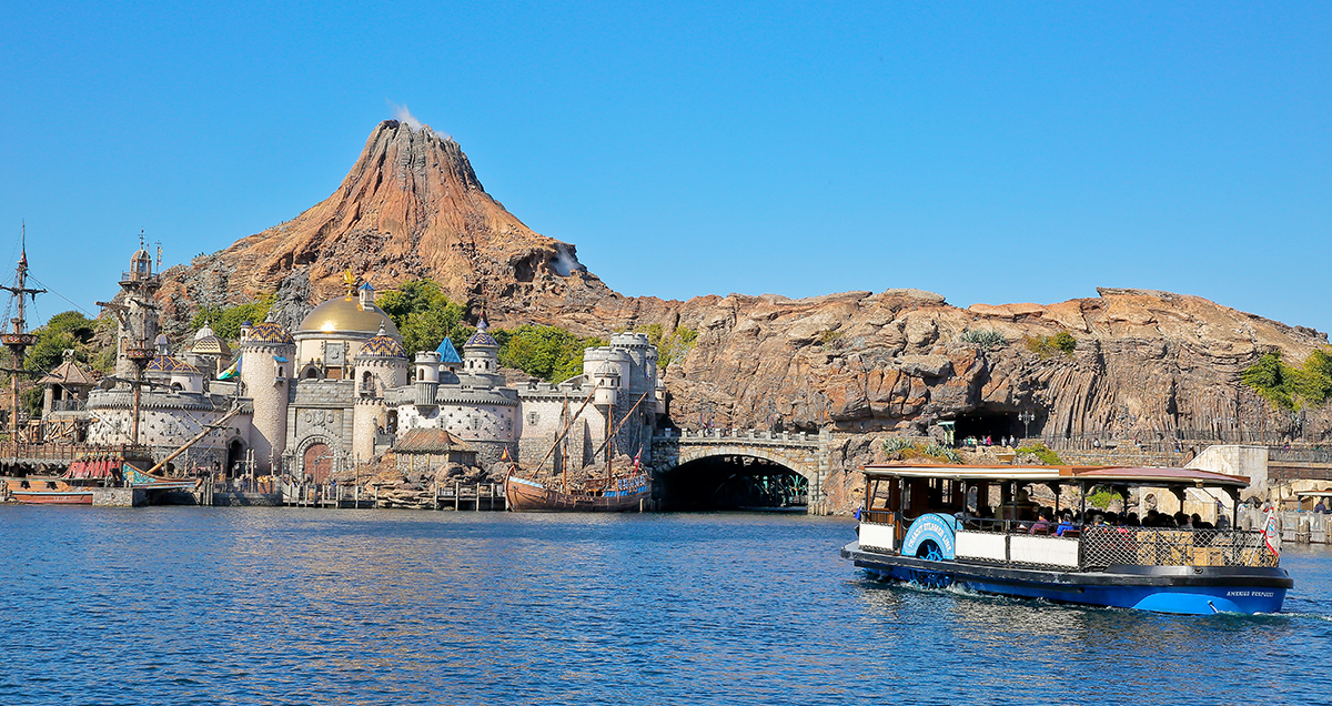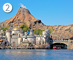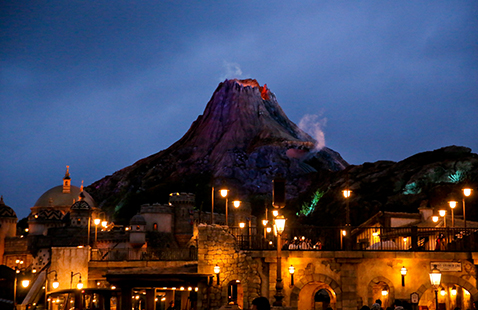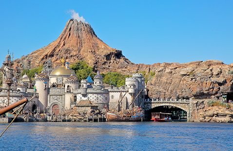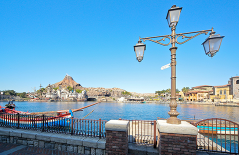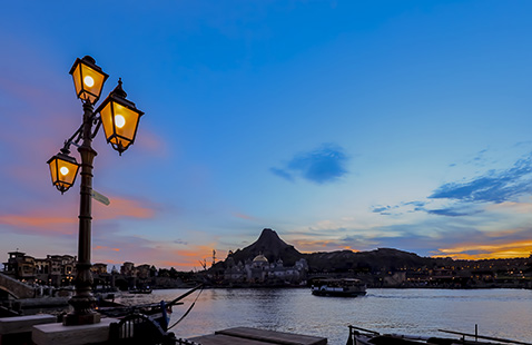 パークエントランスを抜けると、目の前に広がる感動的なシーン…それが、メディテレーニアンハーバー。雄大な海原の向こうには、今にも火を噴きそうなプロメテウス火山や、壮麗にたたずむ要塞=フォートレス。東京ディズニーシー®へ来たなら、必ずおさえておきたいスポットです。夕方から夜にかけて暗くなる前のひとときは、さらにオススメ。キラキラと輝きを増した、メディテレーニアンハーバーのライトアップはいつまでも眺めていたくなります。
