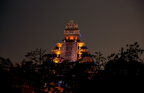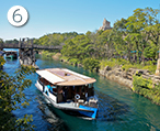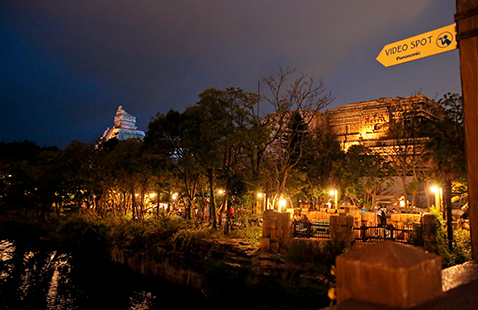 「プエンテ・ブエナ・ヴィスタ」は、スペイン語で“眺めのよい橋”という意味。この橋は、ロストリバーデルタにかかる3本の中で、いちばん大きな橋なんです。ここからは、橋の下を流れる大河、ジャングルから頭をのぞかせるクリスタルスカルの魔宮、そして、木造の橋「プエンテ・アル・テンプロ」が一望できます。橋の下を通り抜けていく蒸気船トランジットスチーマーラインを映像におさめることもできます。