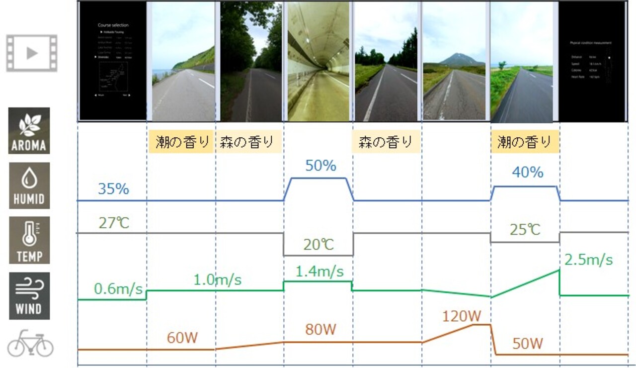 自転車で走る映像に合わせて温度・湿度・気流・香りを制御した空気を供給し、より一層臨場感のあるVR空間を作り出すシステムです。