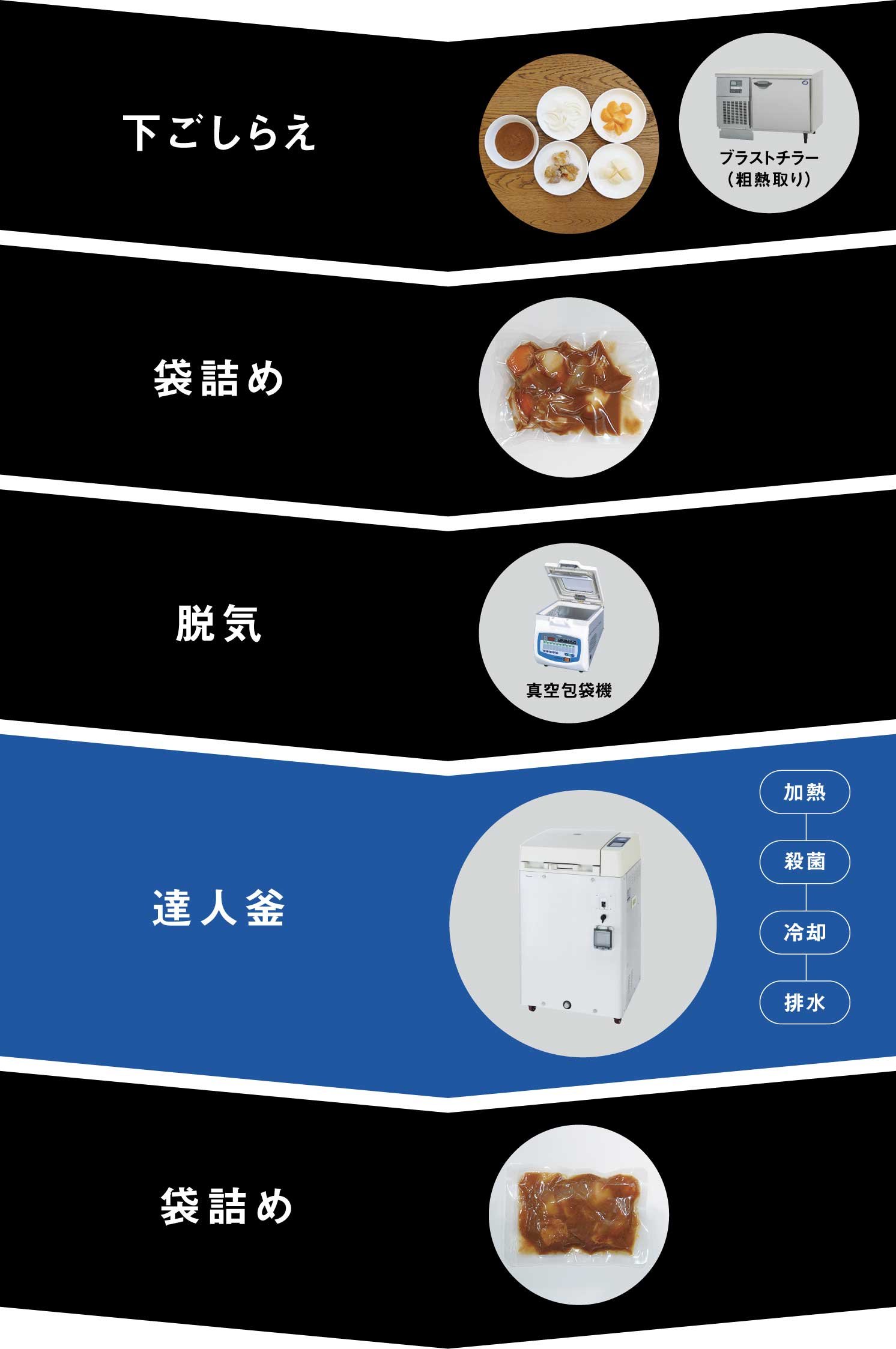 達人釜は、101℃以上の温度帯の真空調理が可能な「小型高温高圧調理機」。パウチのまま高温高圧で殺菌ができ、「オリジナルのレトルト食品」を大型設備と比較して手軽に製造できる。