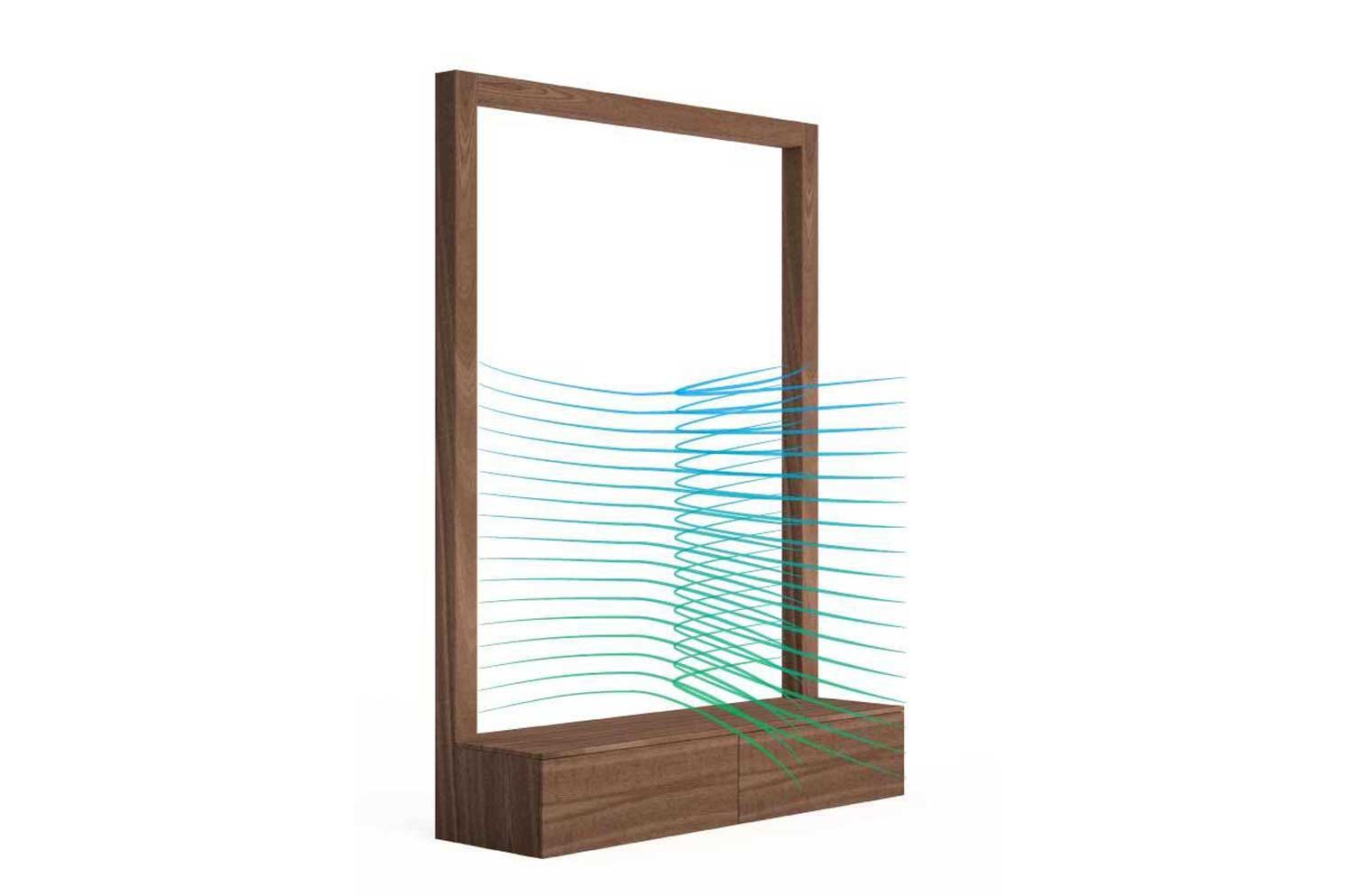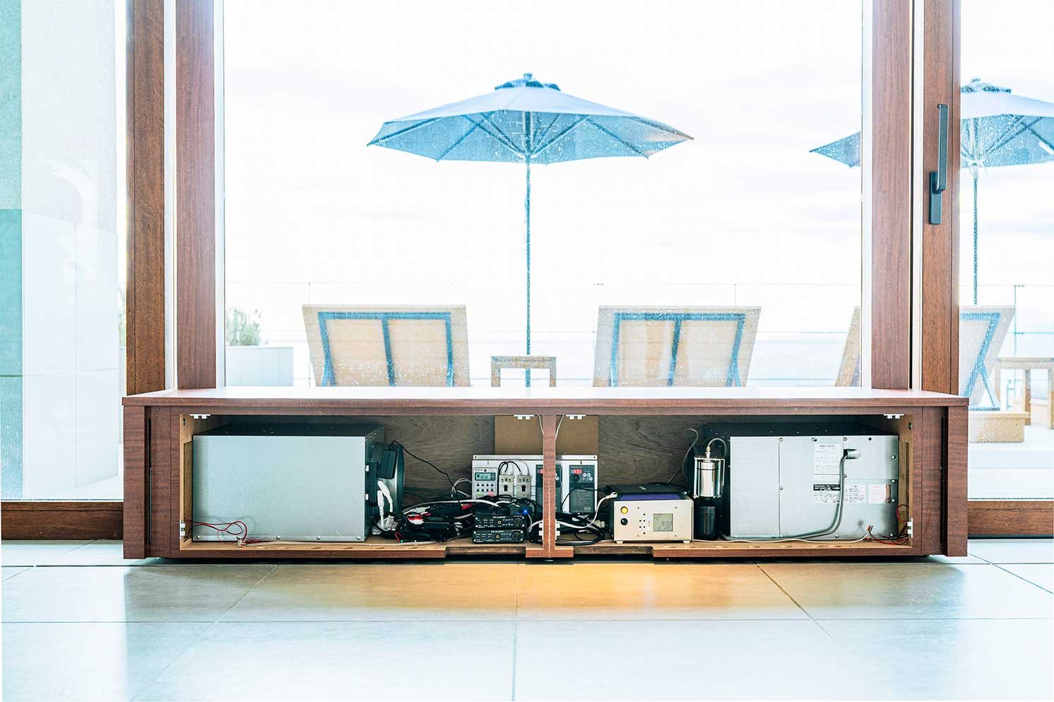 スパの内装に溶け込むよう左右の木のフレームから風が出て、真ん中でぶつかり前方に送られるシステムだそう。ボックスにファンやスピーカーが入っていて、人間に聞こえる音と聞こえない音の両方を流しているとのこと。