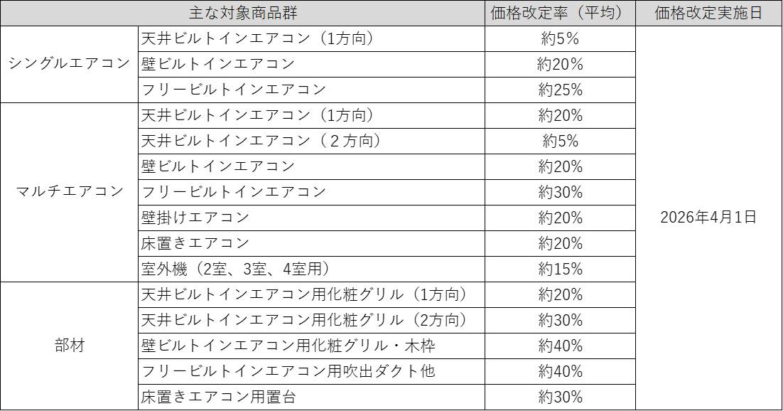 パナソニック株式会社 空質空調社は、住宅設備用エアコンの一部商品・部材について、2026年4月1日より価格改定を実施いたします。