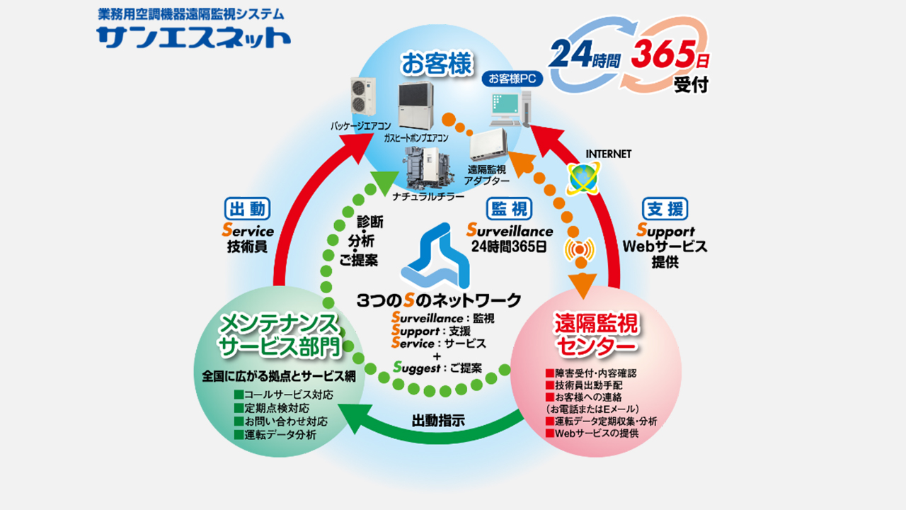 サンエスネットは、お客様と当社の遠隔センター、全国のサービス網をネットワークで結び、空調機に取り付けた遠隔監視アダプターを用いて24時間365日運転状態を監視するシステムです。
