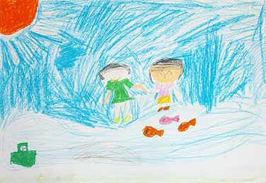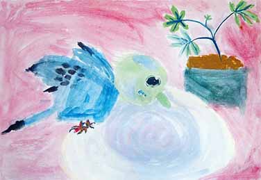 自閉症の小2の男の子。自分自身に一生懸命日々成長している姿を環境くんに手本を見せているかの様な絵です。子供達は環境とお友達になろうとしています。