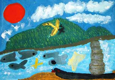 絵にこめた思いは、きれいな川があってそこには魚がいたけど、川がごみだらけになっていたからかわいそうだなと思って書きました。