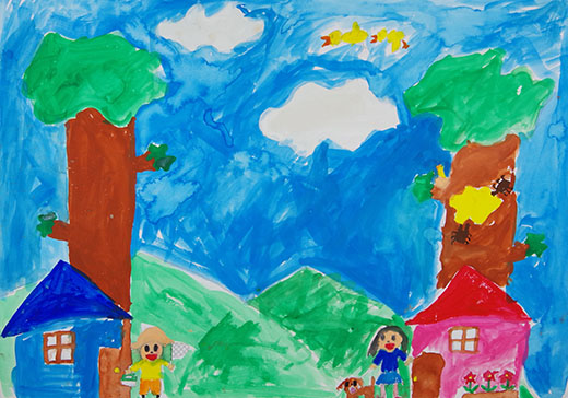 かんきょうの絵をかきました。みどりにつつまれてたのしい絵をかきました。
