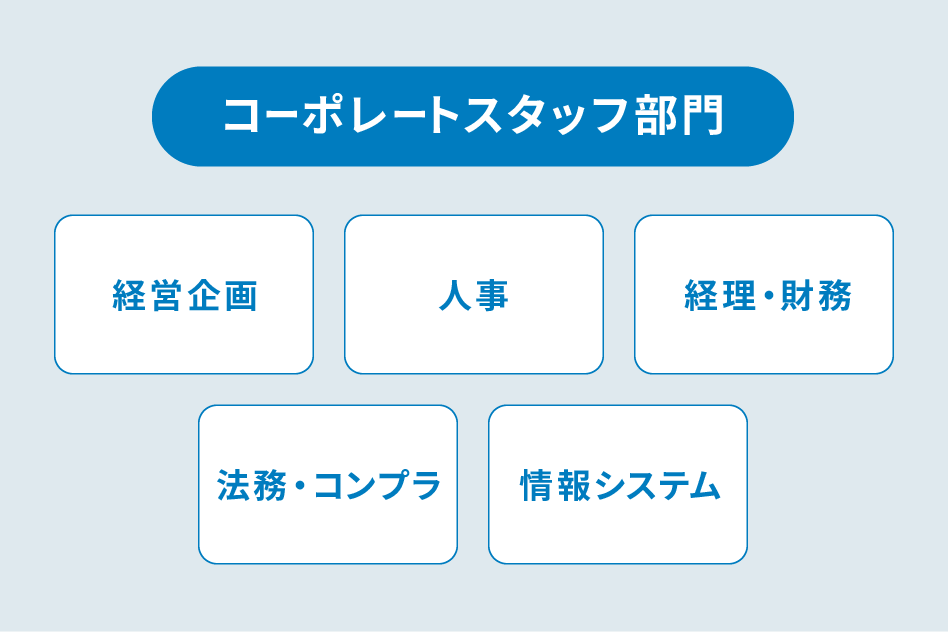 会社および事業を支えるコーポレートスタッフとして、経営企画、人事、経理・財務、法務・コンプラ、情報システムなどの幅広い職種が存在します。
