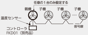 ①コントローラに現在温度表示させるファン(親機)を1台のみ選ぶ。