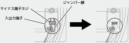 ④左から2番目と6番目のマイナス端子ネジをゆるめ、入出力端子のジャンパー線を外す。