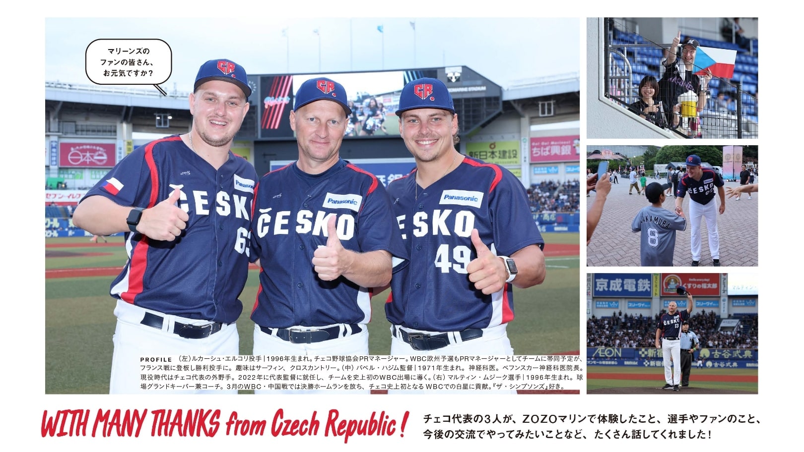 ベースボールブリッジプログラム2023年の WBCをきっかけに生まれた、チェコでの野球振興とスポーツを基軸とした文化交流を推進する、千葉ロッテマリーンズ主導のプログラム。チェコの古都・プラハにかかるカレル橋のように 、 時代を超えて人々をつなぎ続けることを願い、さまざまな企画を実施します。© CHIBA LOTTE MARINESマリーンズ-チェコ