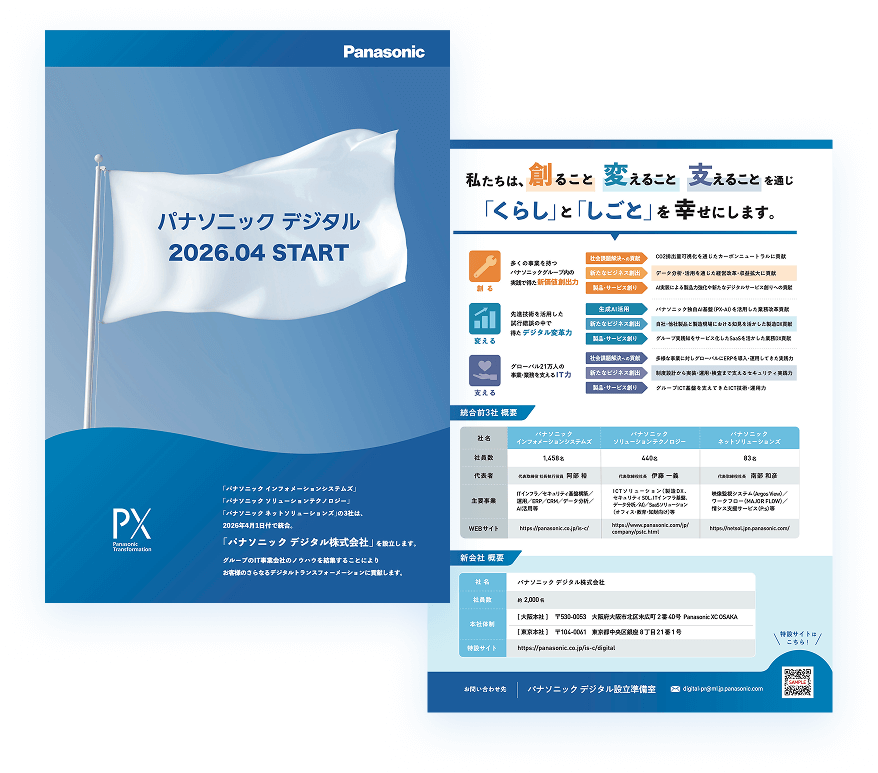 パナソニック インフォメーションシステムズ株式会社、パナソニック ソリューションテクノロジー株式会社、パナソニック ネットソリューションズ株式会社の3社は2026年4月1日付で統合し「パナソニック デジタル株式会社」を設立します。今後、パナソニックグループが注力していくソリューション領域の事業強化を目指し、設立に向けた手続きを進めていきます。