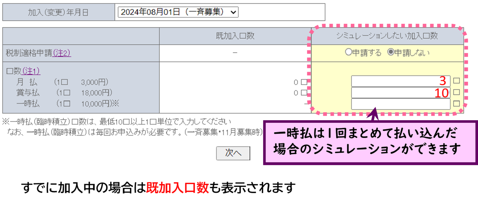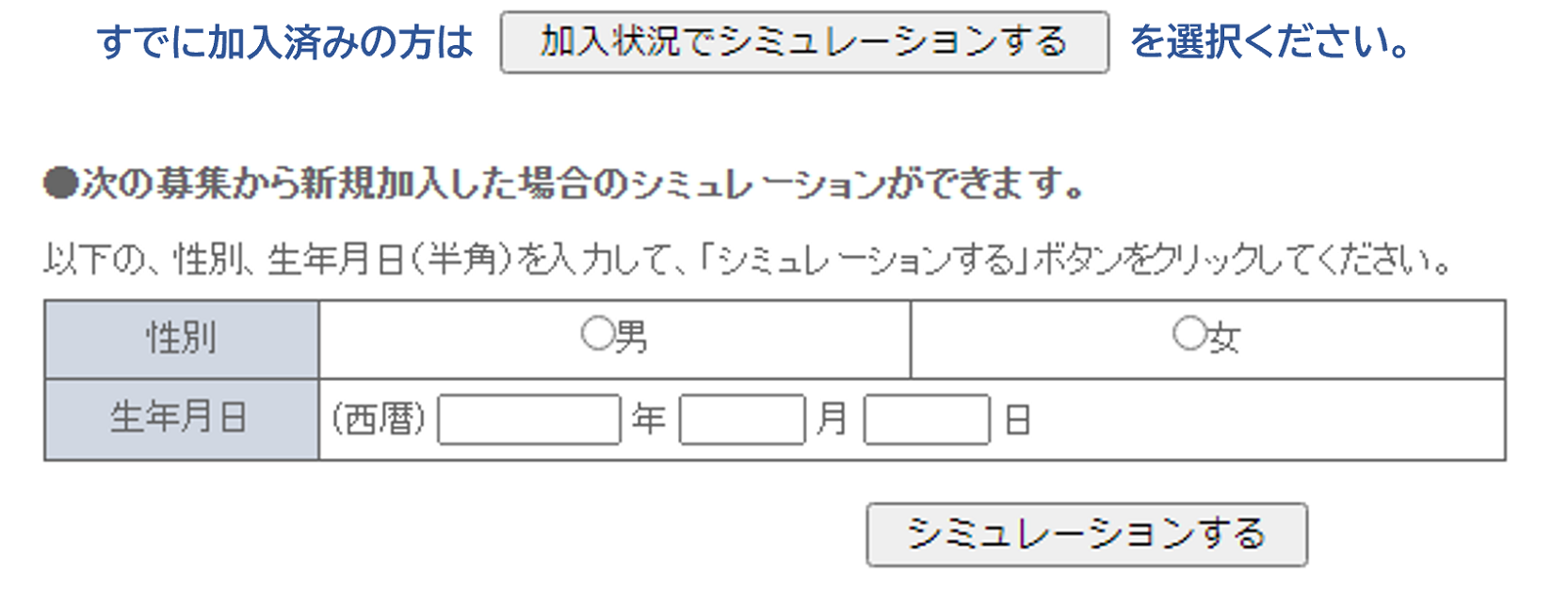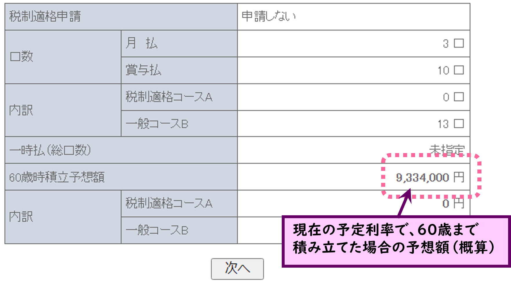 すでに加入中の場合は現在までの残高も反映した予想額が表示されます