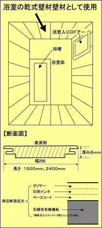 | 在来工法の浴室の壁面 に貼る水回り内装材 (一般名称) 不燃水回り内装材 (当社商品名) バスカベDX 【図1】 |