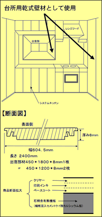| 住宅用台所の壁面に 貼る内装材 (一般名称) 不燃内装壁材 (当社商品名) キッチンカベ 【図2】 |