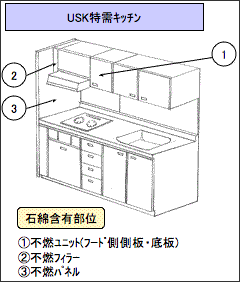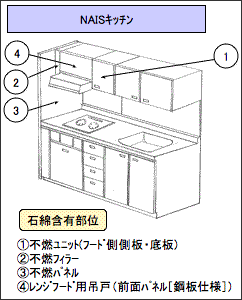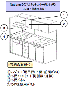 ※上表製造時期よりも古いキッチンでレンジフード廻りの部位(例:【図1】①~④)が含まれる場合、石綿含有素材(レベル3)の可能性がありますので「石綿飛散漏洩防止対策徹底マニュアル」等に基づき対応をお願いいたします。 不明点がございましたらお問合せいただきますようお願い申し上げます。