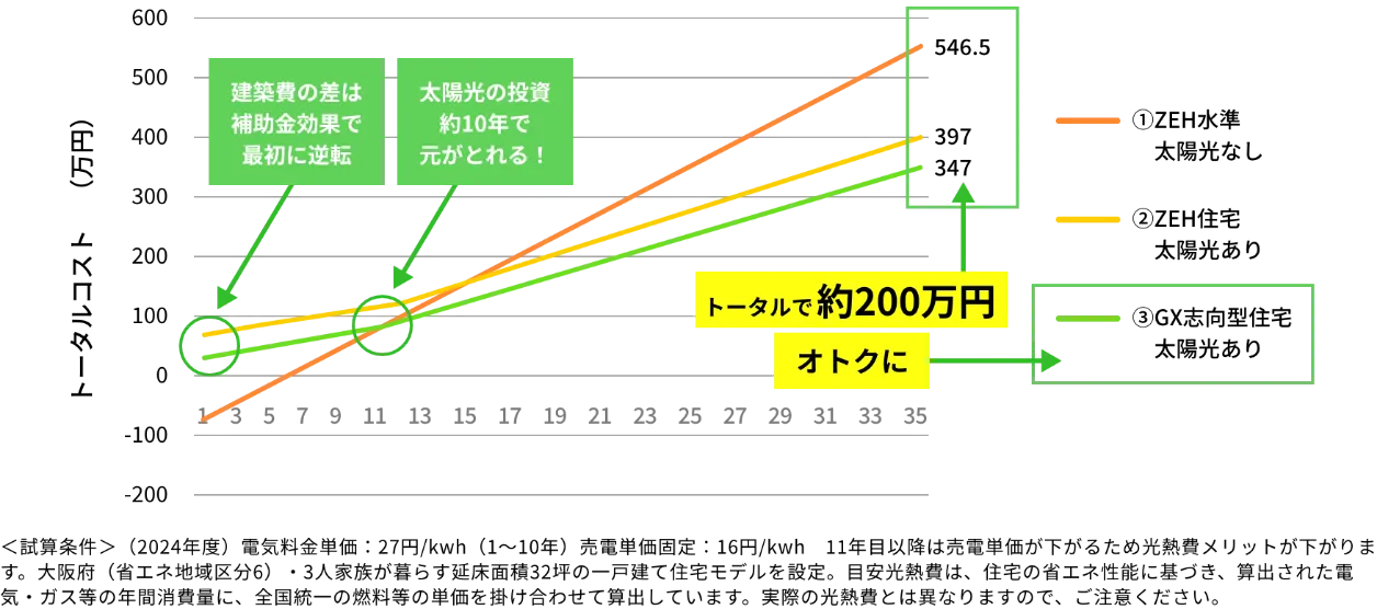 <試算条件>(2024年度)電気料金単価:27円/kwh(1〜10年)売電単価固定:16円/kwh 11年目以降は売電単価が下がるため光熱費メリットが下がります。大阪府(省エネ地域区分6)・3人家族が暮らす延床面積32坪の一戸建て住宅モデルを設定。目安光熱費は、住宅の省エネ性能に基づき、算出された電気・ガス等の年間消費量に、全国統一の燃料等の単価を掛け合わせて算出しています。実際の光熱費とは異なりますので、ご注意ください。