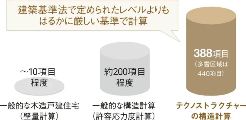 テクノストラクチャーでは、独自の基準を設け、法律で定められた水準を大きく上回る388項目(多雪区域は440項目)のチェックを実施しています。構造的に負担のかかる、ほぼすべての部位の強度と住まい全体のバランスを十分に確保します。