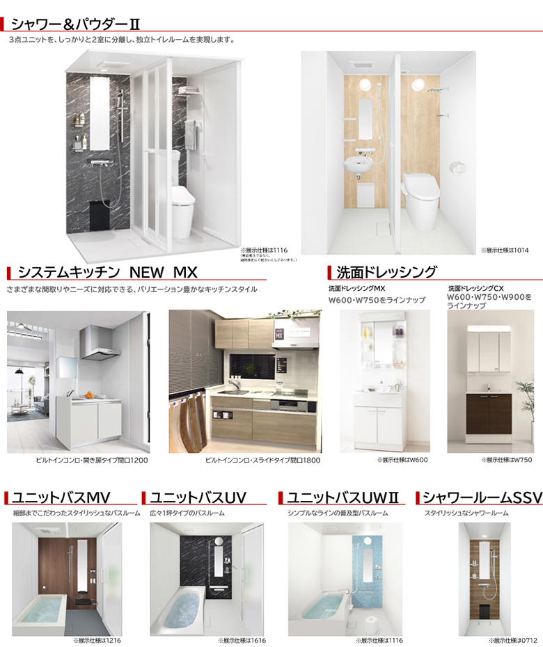 AWE-LABでは、集合住宅用バスルーム、シャワールーム、洗面化粧台、キッチンの展示をいたしております。