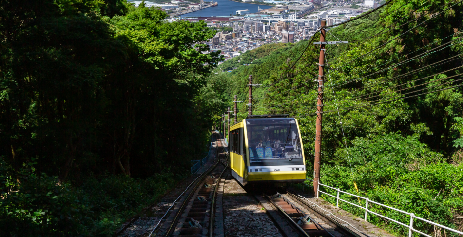 北九州工場から見える皿倉山には、ケーブルカーとスロープカーがあり、気軽に山頂に登れます。山頂からは北九州が一望できます。