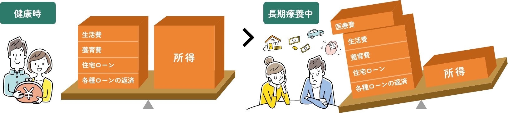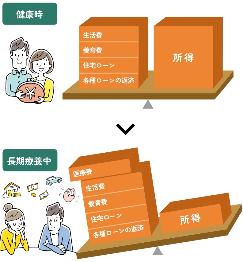 働けなくなり所得が減少しても、生活に必要な支出は続きます・・・