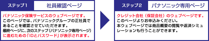 『社員確認ページ』の最終ページに、クレジット会社(保証会社)の『パナソニック専用ウェブページ』へのリンクとログインするためのID・パスワードが表示されます。 - ウェブからのお申込み