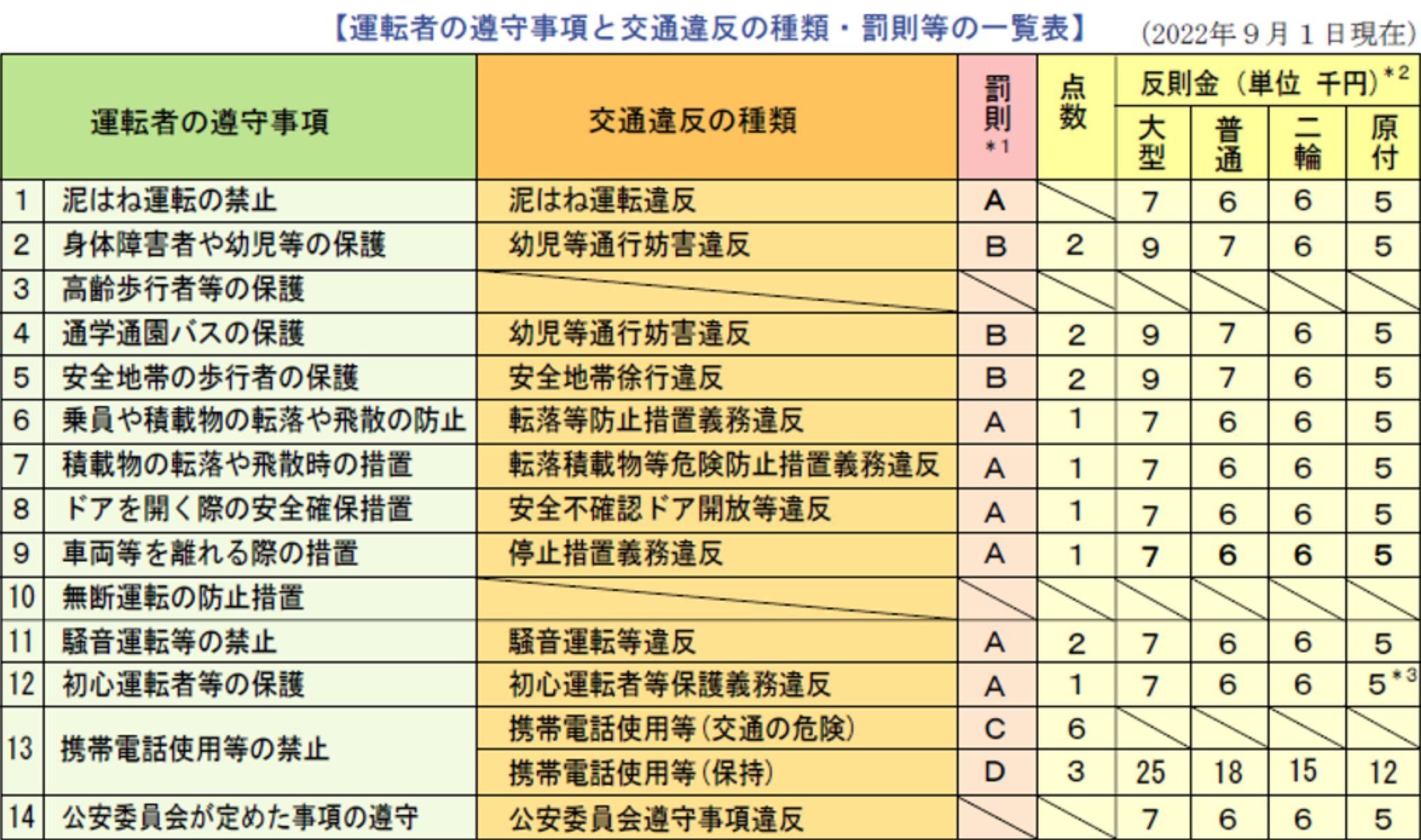 は30万円以下の罰金」、Dは「6か月以下の懲役又は10万円以下の罰金」となります。 - *2「反則金」の欄の「大型」には、「中型」、「準中型」、「大型特殊車」が含まれ、「原付」には、「小型特殊」が含まれます。
