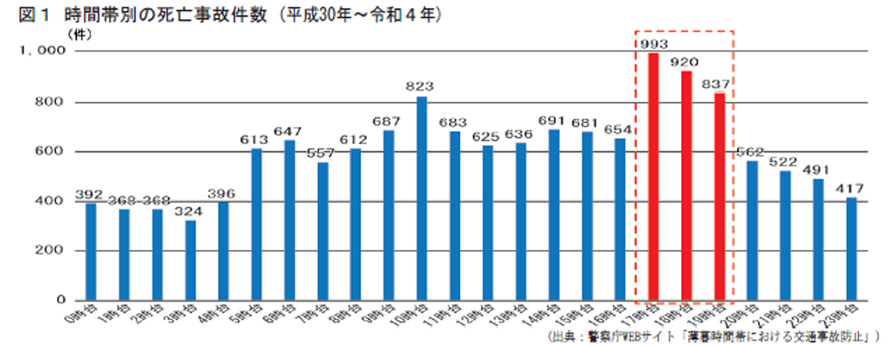 警察庁ホームページの「薄暮時間帯における交通事故防止」に、平成30年~令和4年の5年間における薄暮時の死亡事故の分析結果が掲載されています。そこで今回は、警察庁の分析からみえる薄暮時の死亡事故の特徴と、薄暮時から夜間における対歩行者事故防止のポイントについてまとめてみました。