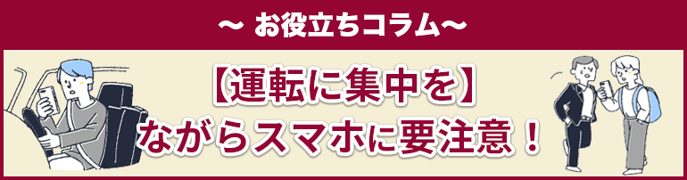 ラジオや音楽を聴きながら運転するのと同じように考えてしまいがちな「ながらスマホ」での運転ですが、道路上で周囲から目を離し、ときにはハンドルからも片手を離したまま運転すると考えると、大変危険な行為であると分かります。スマートフォンを触る場合は、まずは安全な場所に車両を停めてから操作するように心がけるなど、「ながらスマホ」を防ぐ工夫をしましょう。