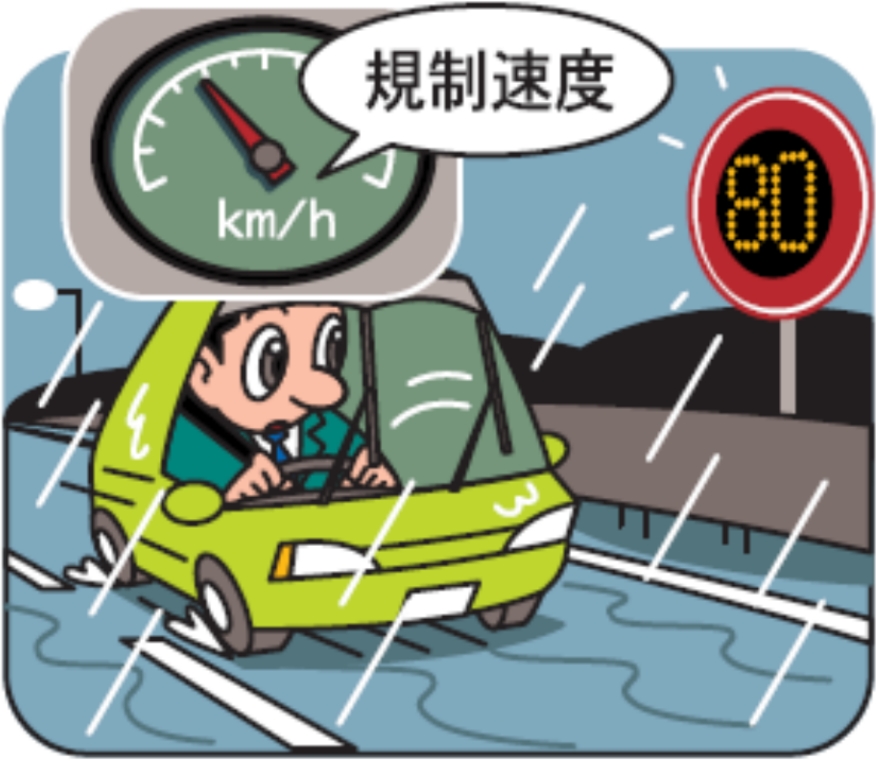 高速道路では、天候や道路工事、交通事故など交通環境の変化に応じて最高速度が規制されます。雨天時も降雨の状況に応じて速度が規制され、通常時は最高速度が時速100キロの区間でも時速80キロ以下になります。雨天時に走行する時は、可変式の速度規制標識や電光掲示版などに注意し、速度が規制されている時は必ずそれを守って走行しましょう。雨天時の高速道路でスピードを出し過ぎると、路面にできた水の膜のうえを水上スキーのようにタイヤが滑走して、ハンドルもブレーキも効かない「ハイドロプレーニング現象」が発生する危険がありますので、十分な注意が必要です。