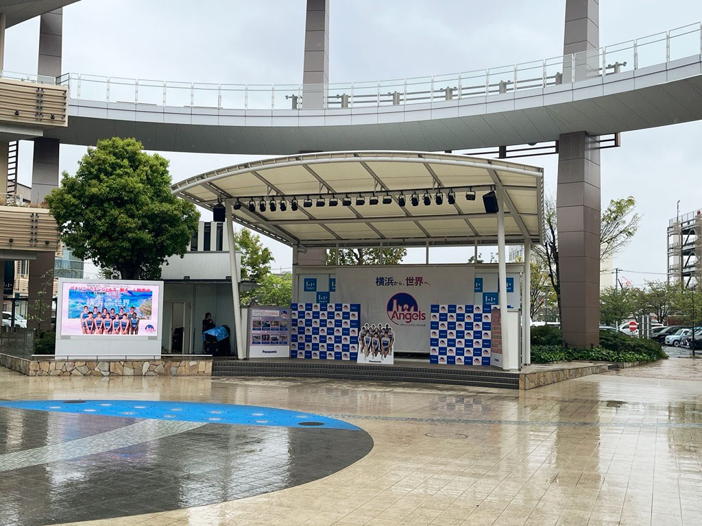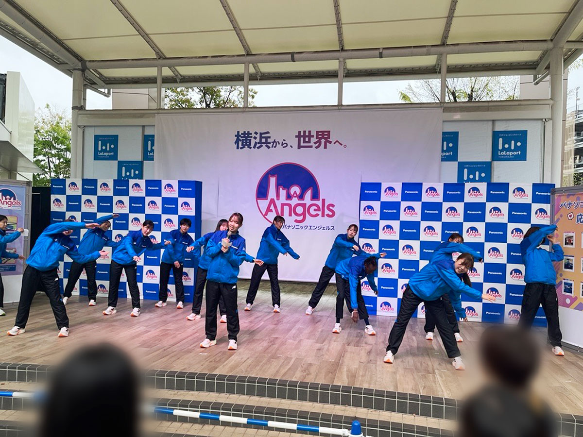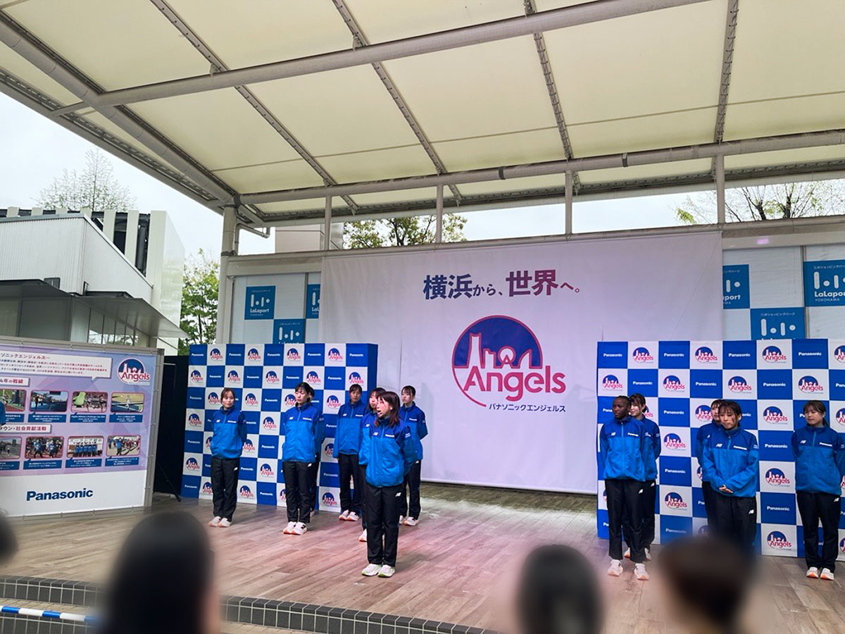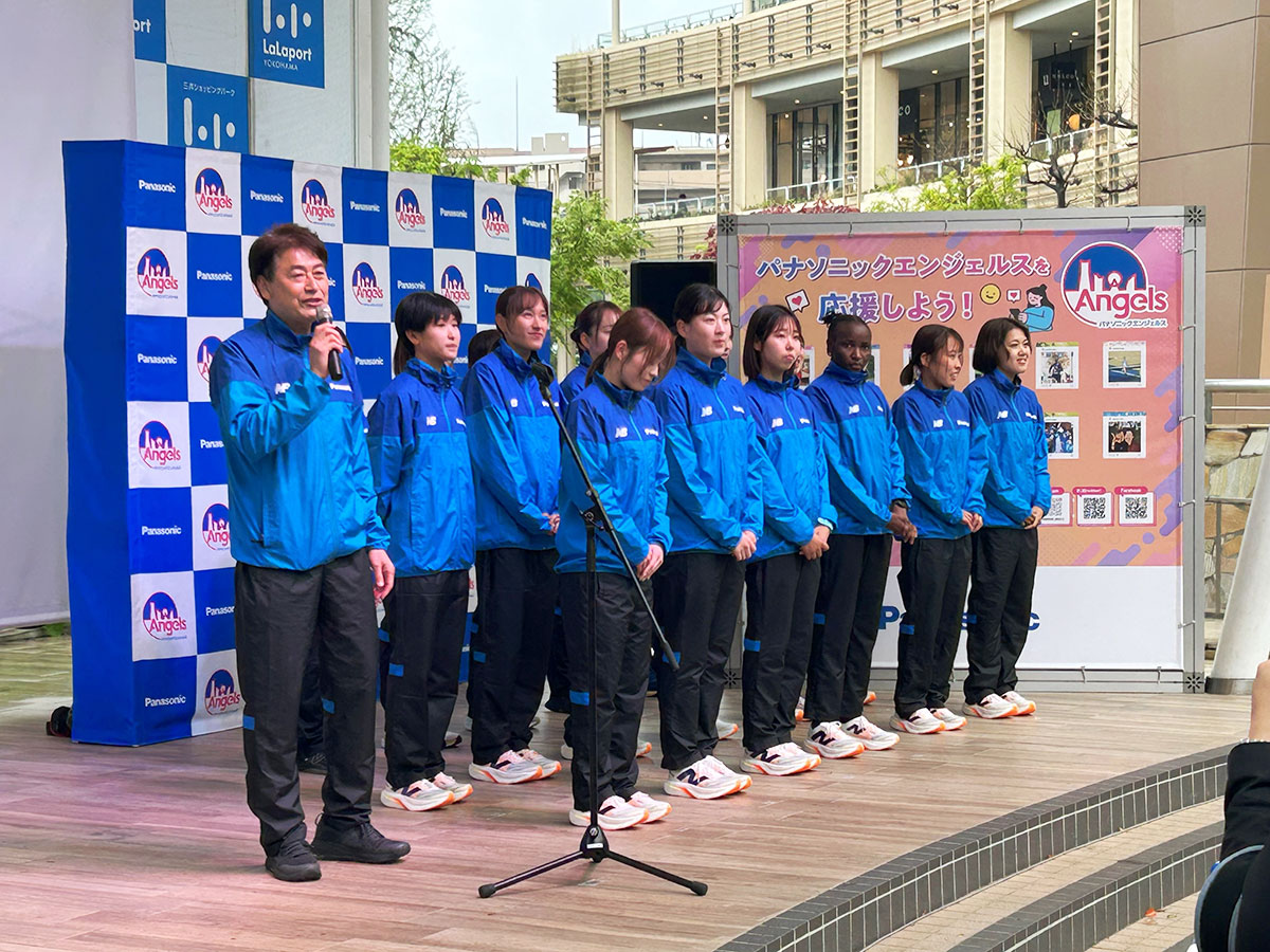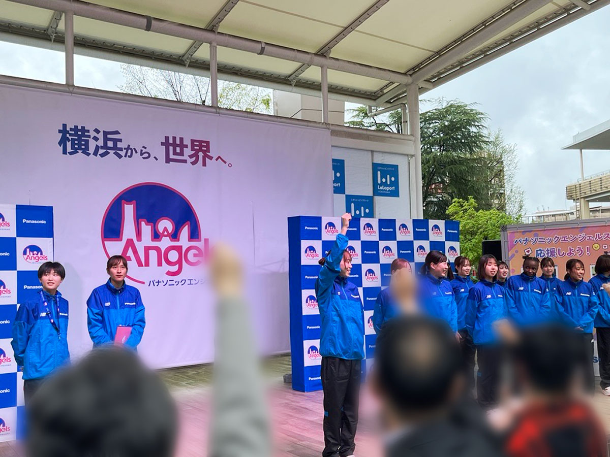 4月13日(日)に三井ショッピングパーク ららぽーと横浜(横浜市都筑区)の屋外イベント広場にて、新チーム発表イベント「春が来た。新チームスタート。パナソニックエンジェルス新チーム発表会」を開催しました。当日は生憎の雨にも関わらず、約100名の方がお越しくださり、事前に社内や合宿地で念入りなリハーサルを行った選手スタッフが全員参加して、チーム初となる街頭イベントを無時に終えることが出来ました。