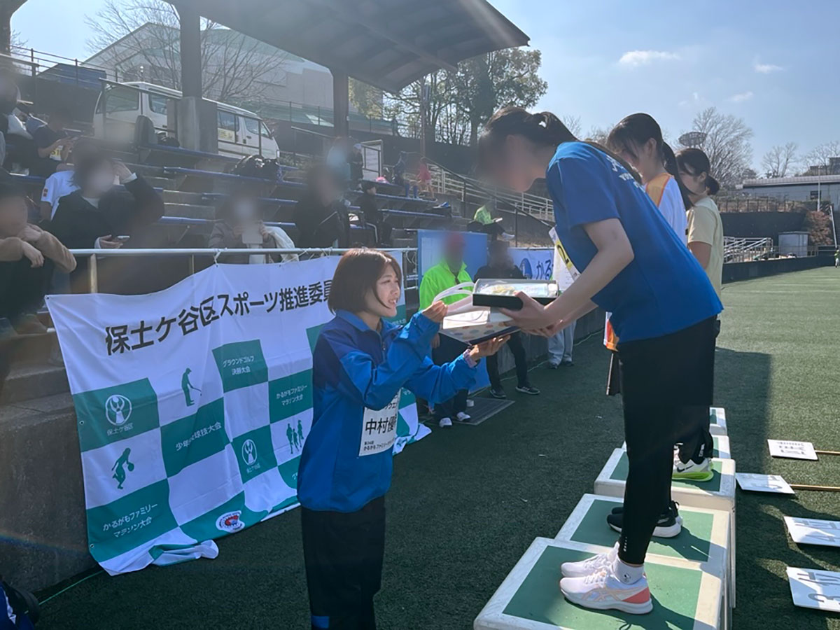 エンジェルス達も、ランナーの皆様と一緒に、名所となっている梅の花が咲き始めた走路を楽しく走りました。特に2kmの部には「親子の部」があり、小学生と保護者がまるで「かるがも親子」のように手をつないでゴールする姿が微笑ましく非常に印象的でした。試合後の表彰式では入賞者に景品をお渡しするプレゼンターを務めたり、サインや記念撮影に応じたりと皆様と一日楽しく過ごしました。