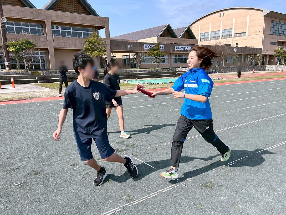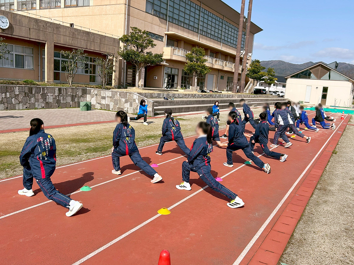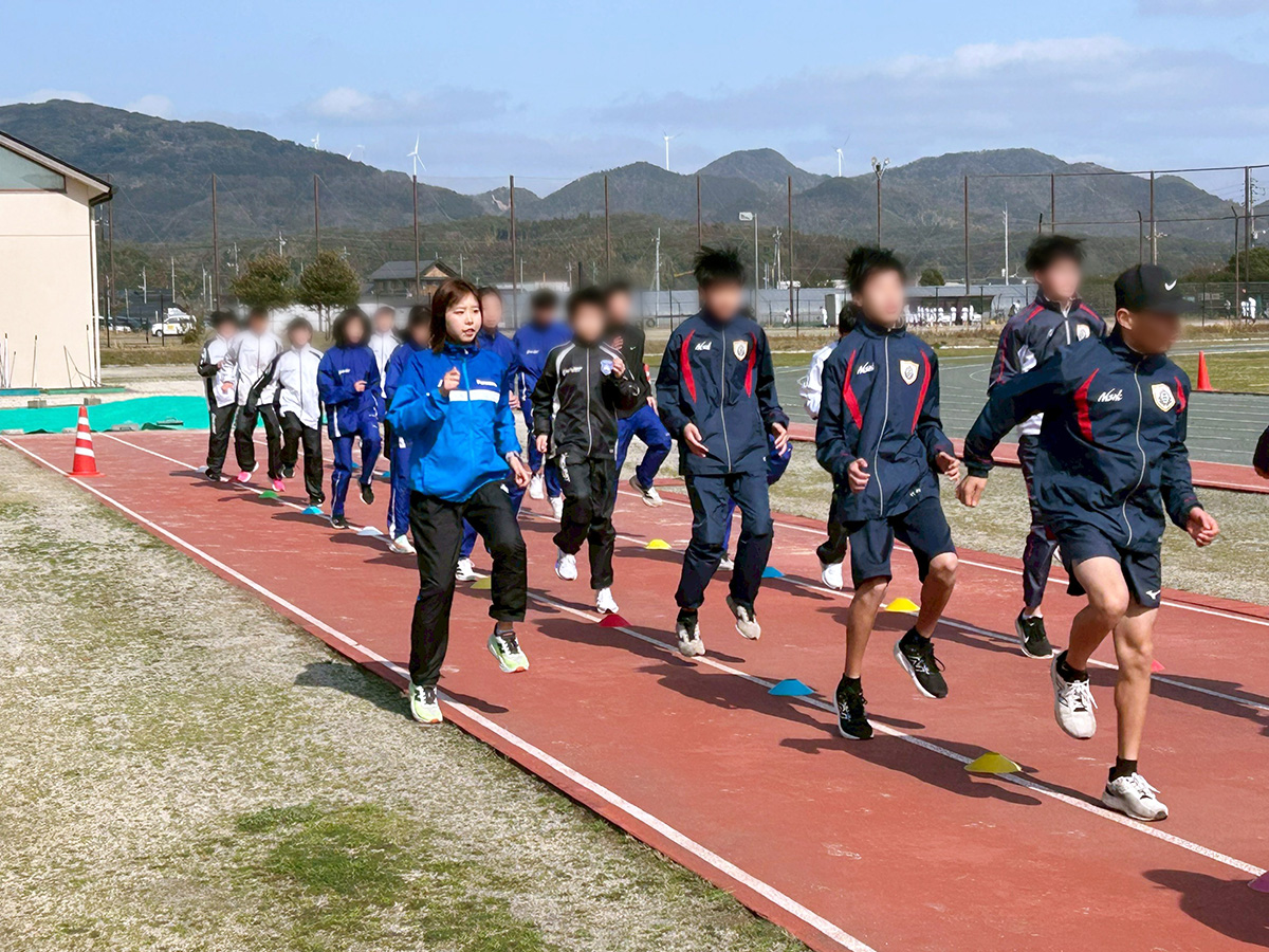 翌3月1日(日)、市内平田スポーツ公園内陸上競技場にて「中長距離陸上教室」が開催され、吉川コーチが講師、境田選手がアシスタントとして招かれ、市内中学校陸上部の生徒23名と陸上部顧問の先生方が参加しました。この催しは出雲市・山陰パナソニック株式会社・パナソニック スポーツ株式会社のスポーツ連携協力協定に基づき企画されました。吉川コーチから陸上教室の目的や内容について説明があり、ウォーミングアップでグラウンドを1周、その後、「動きづくり」として体幹や股関節を強化や操作するトレーニングを実施。参加の生徒さんは始めは辛そうな表情をしたりしていましたが、段々と身体も温まり熱気を帯びてきました。そして最後にチームに分かれて「マイルリレー」を実施。チームごとに作戦会議の後スタートすると、応援する声で会場は大いに盛り上がりました。質疑コーナーの時間では沢山の生徒から時間をオーバーするほど質問が飛び出しました。生徒代表からお礼があり、全員で記念撮影やサイン会をして陸上教室はお開きとなりました。