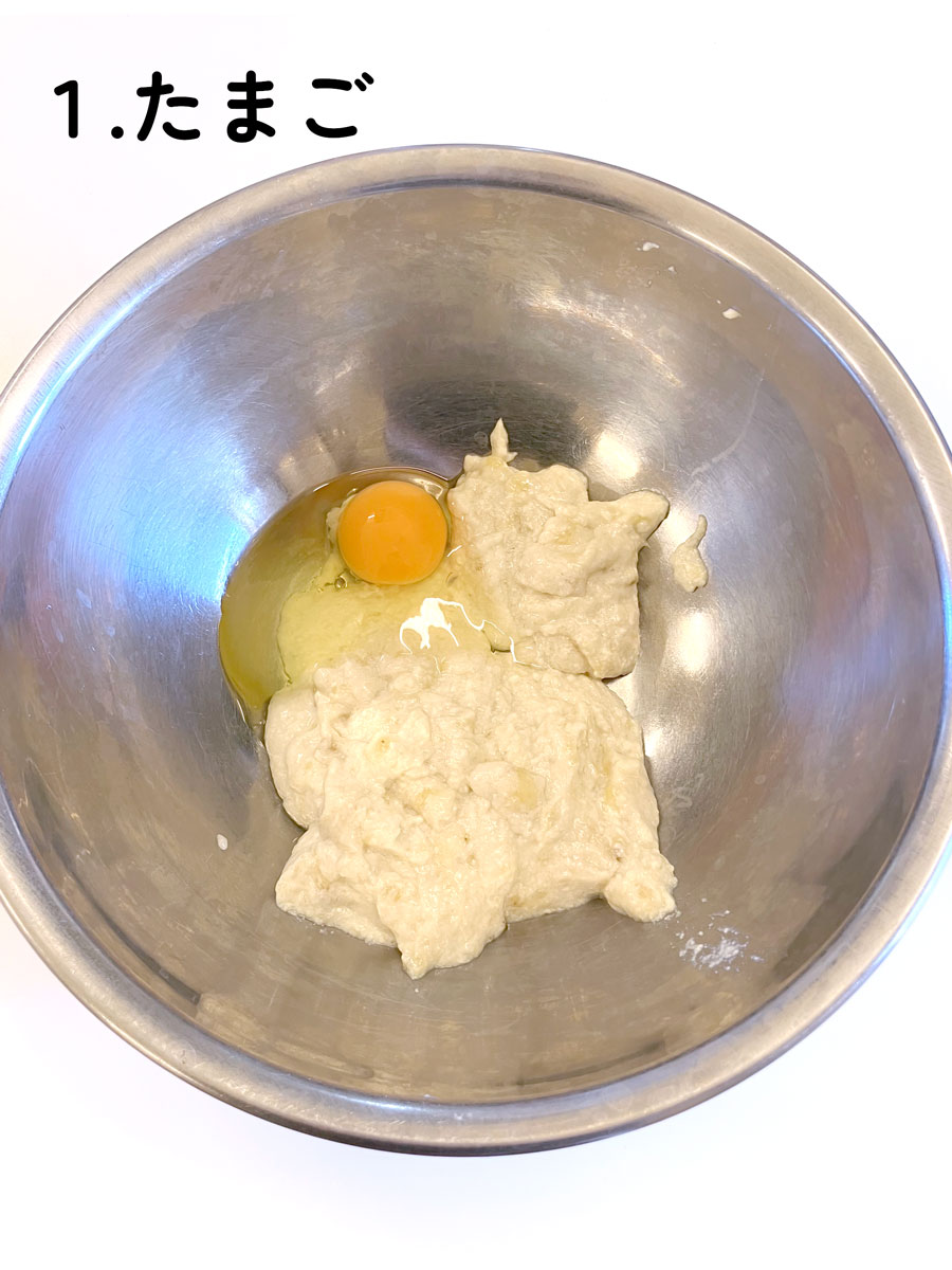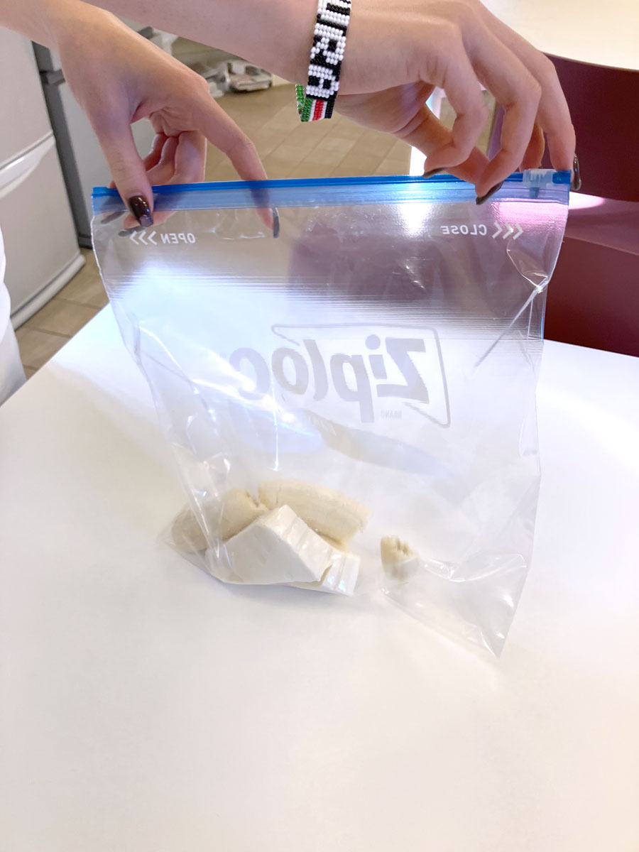 ❶軽く水切りした絹豆腐とバナナを袋に入れてよくつぶす。