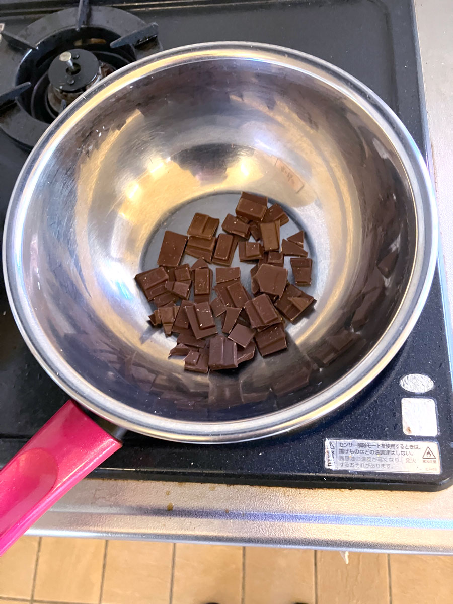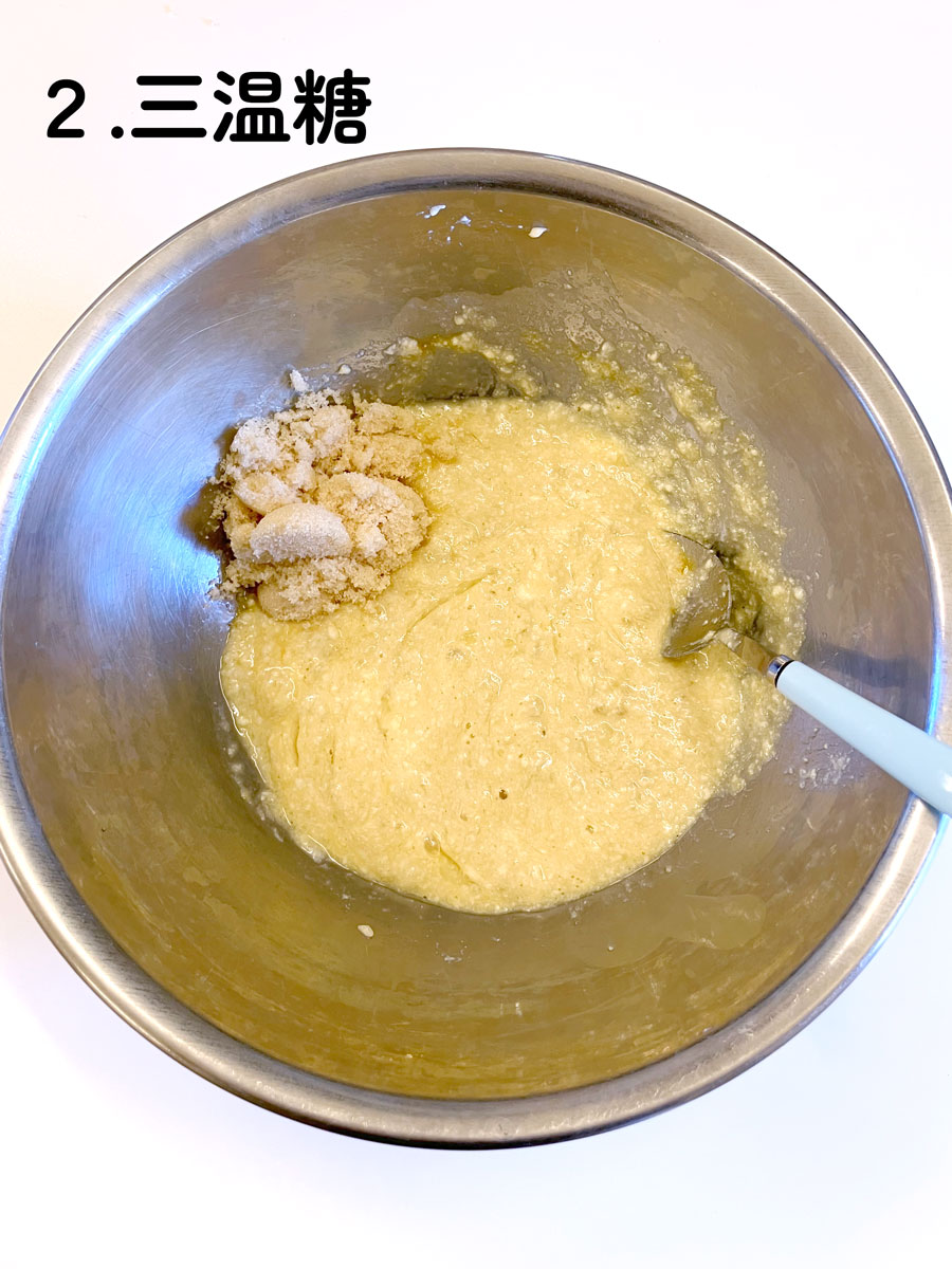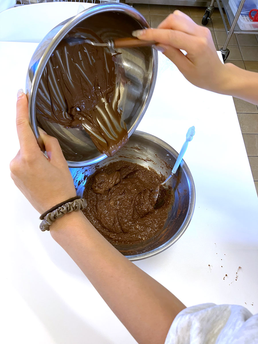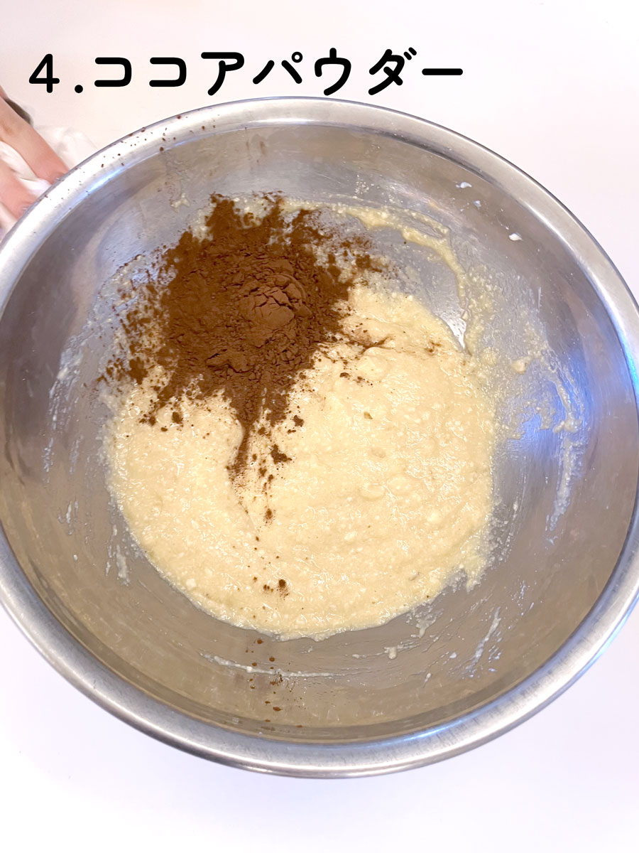 ❸①をボウルに移し、⭐の(たまご→三温糖→おからパウダー→ココアパウダー)を順に入れて、最後に②(溶かした板チョコ)を入れ、都度混ぜ合わせる。