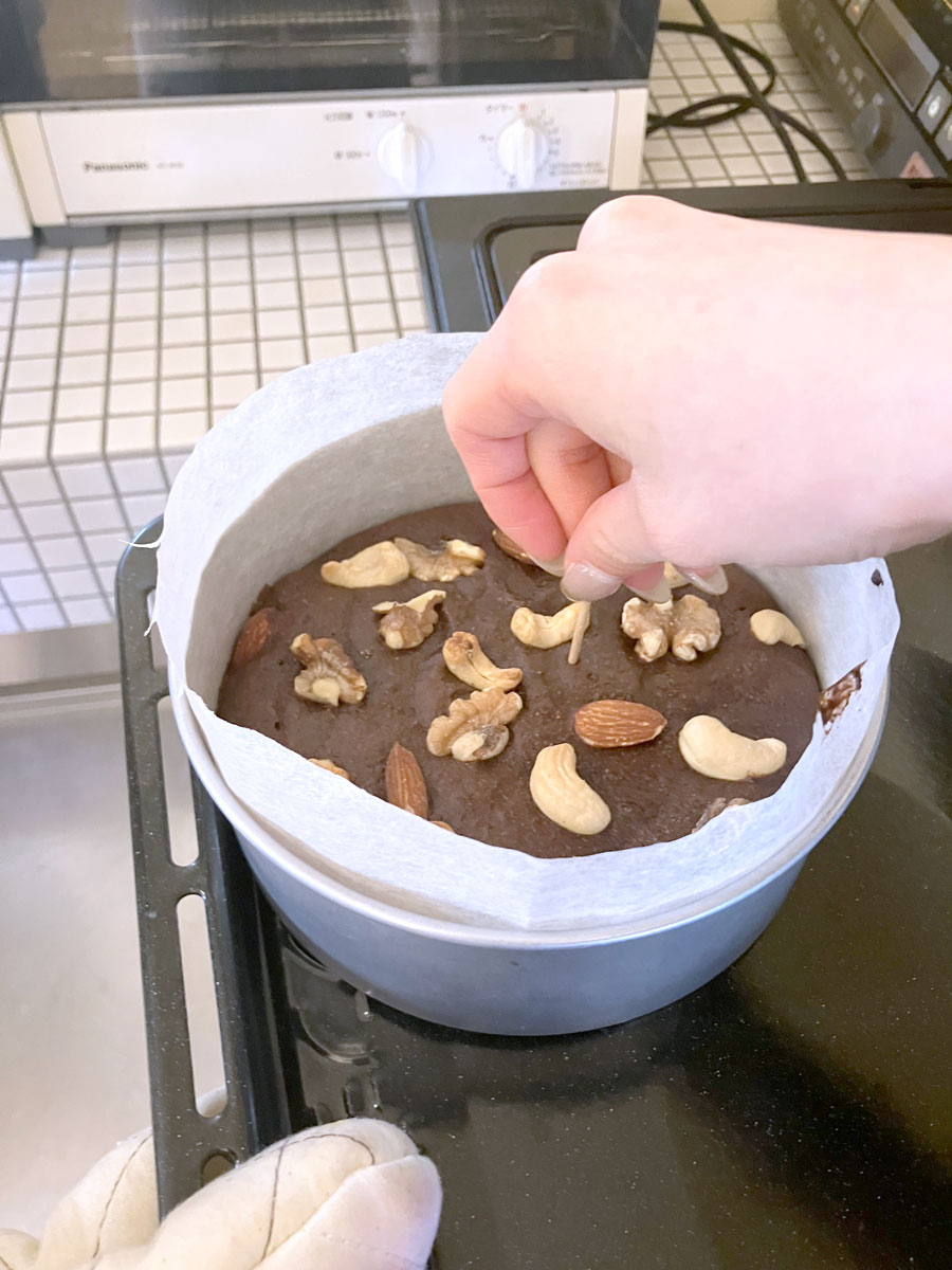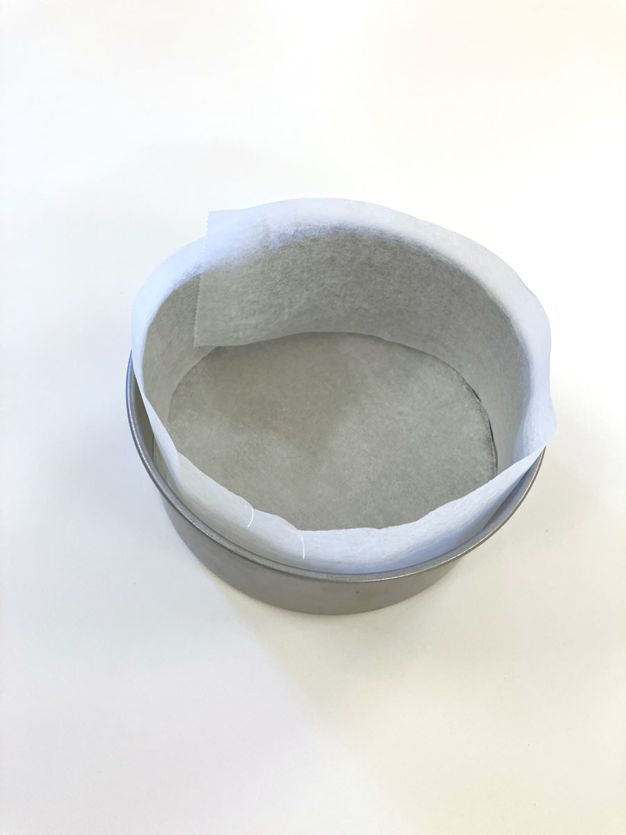 ❹クッキングシートを敷いた型に生地を流し入れて慣らす。