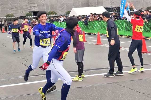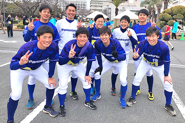 社内へのPRも、今までにない取り組みを始めています。その一例がライフソリューションズ社主催の駅伝大会への出場です。同社所属の選手が職場でお誘いをいただいたのがきっかけで、野球部チームを編成して初出場しました。ユニフォーム姿の選手に「野球部がんばれ!」と沿道からたくさんの声援をいただき、中には背番号を見て「20番、もっと行け!」と激励してくださった方もいたそうです。選手もいい顔をして走っていましたし、社員の皆さまに野球部の存在を間近で感じていただくことができました。