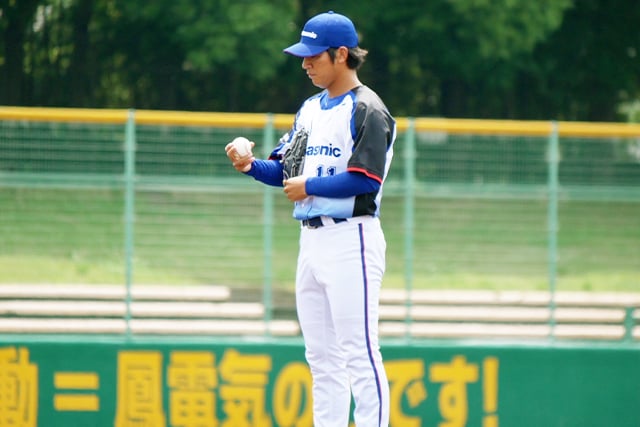 都市対抗近畿予選第4代表トーナメント2回戦のマウンドを託されたのはエースの與座でした。初回から、最速147キロの伸びのあるストレートと多彩な変化球で三者凡退に押えます。