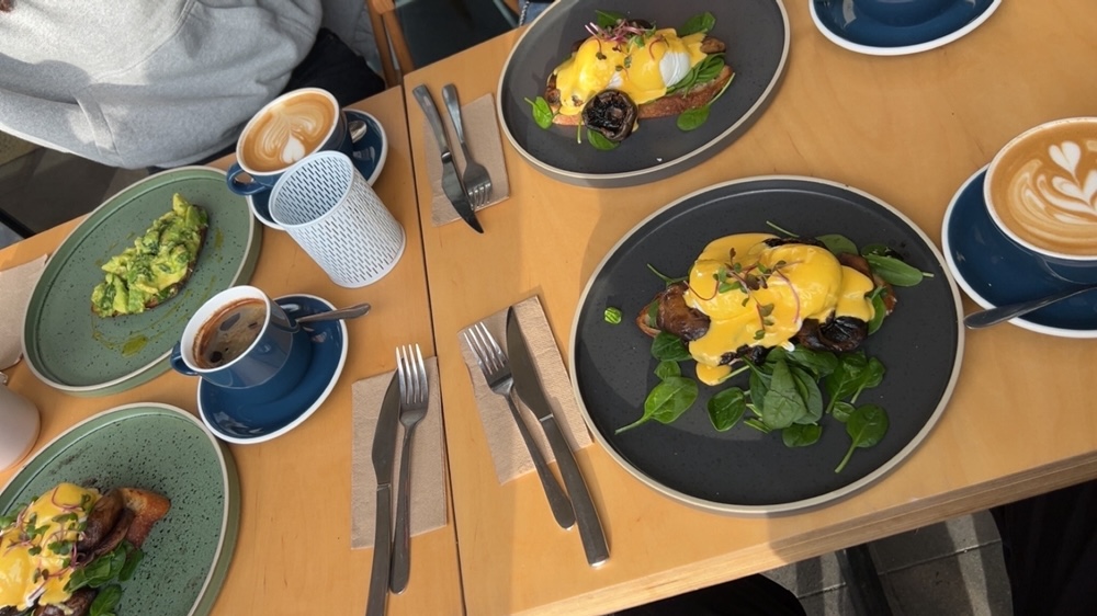 海の近くにあるカフェで朝ごはんを食べ、とても美味しくて気分も上がりました。